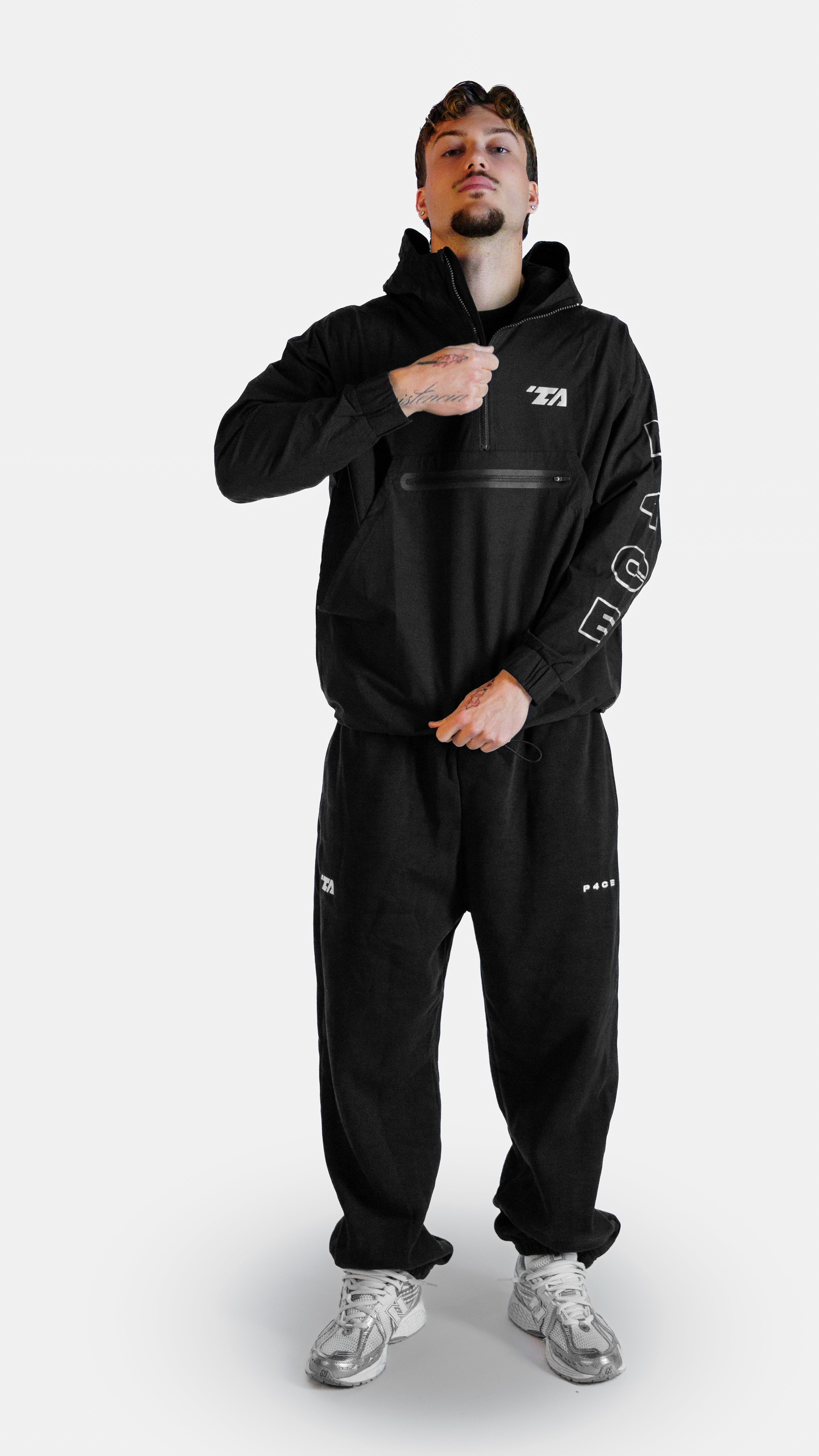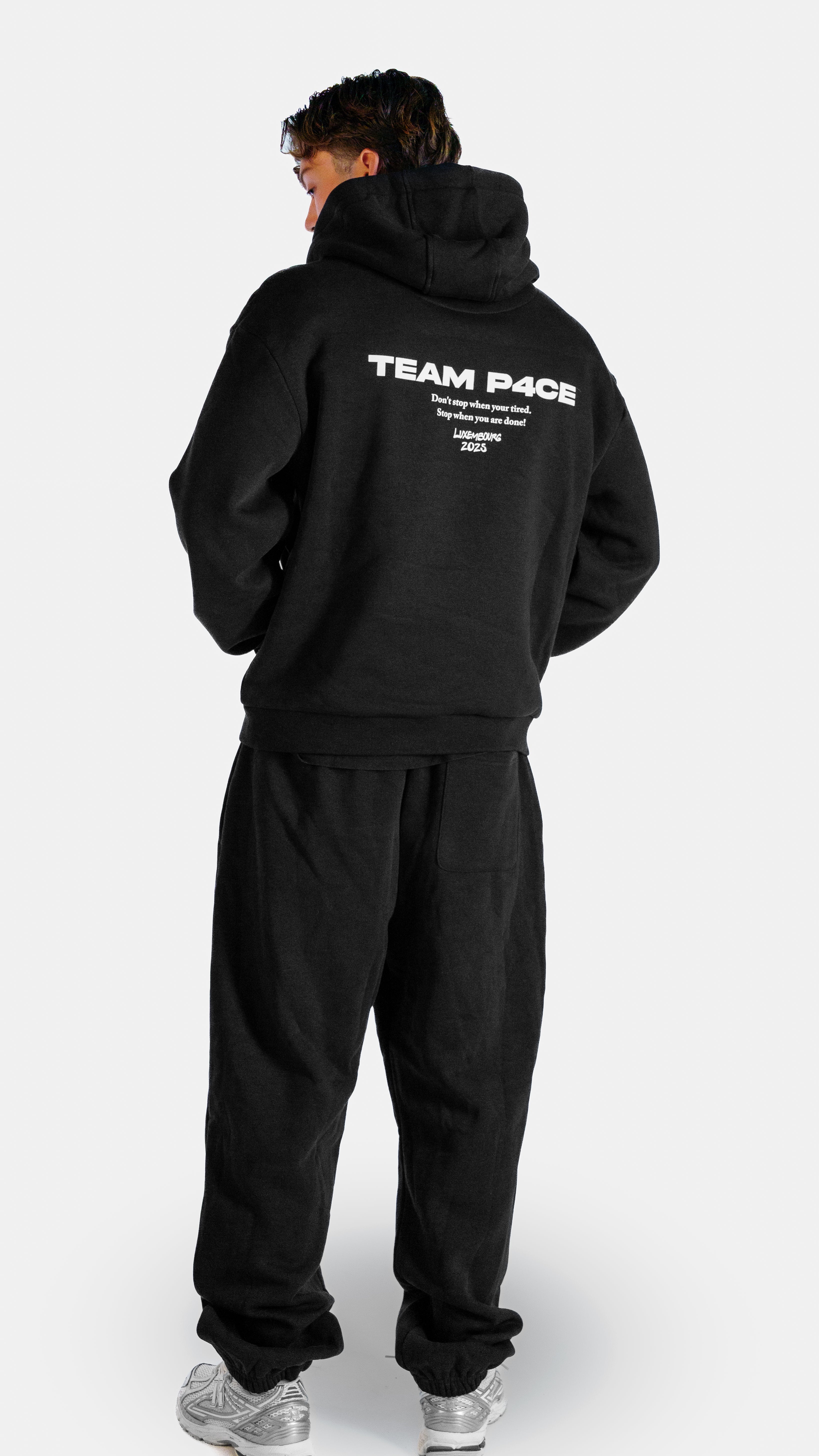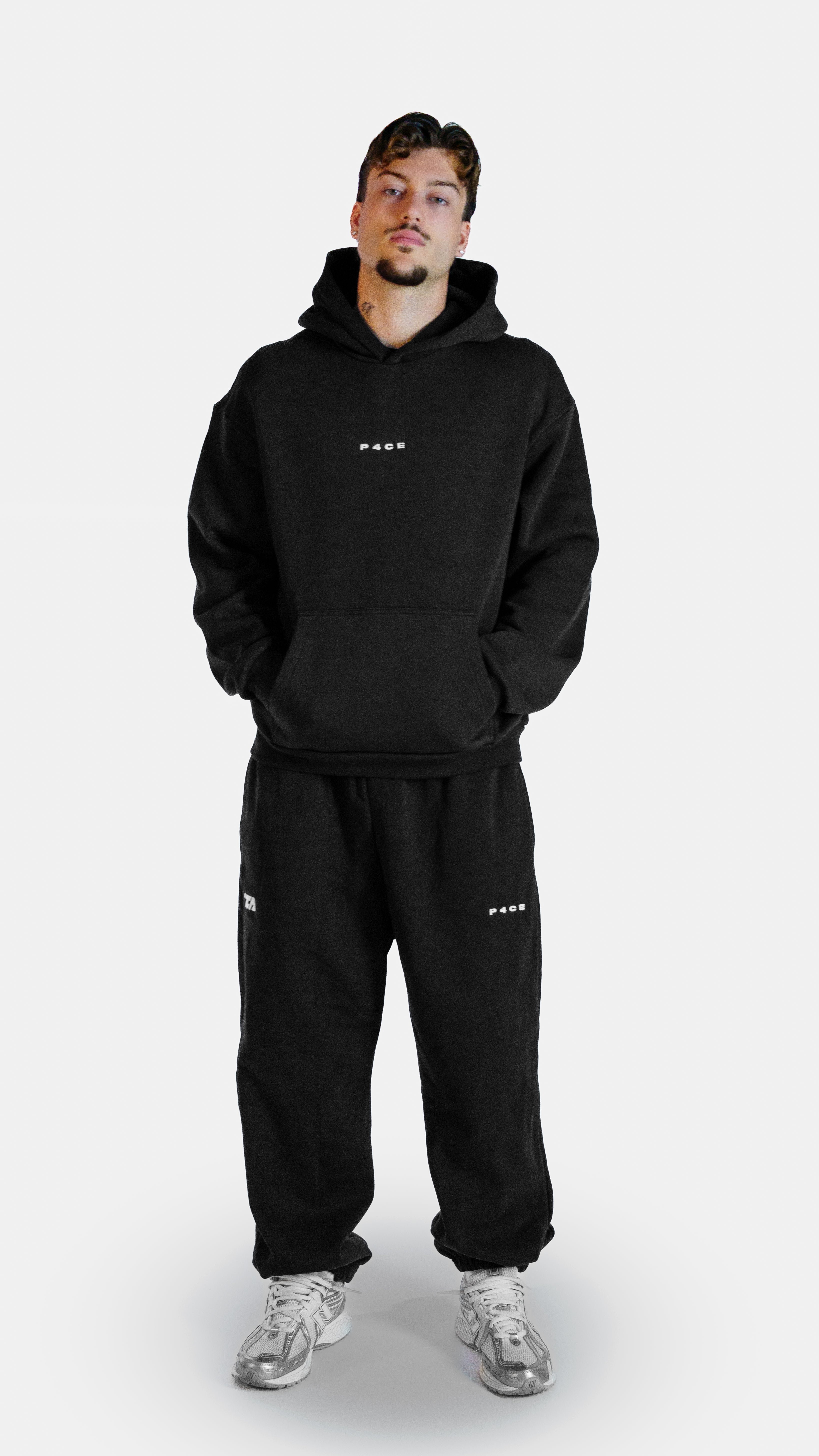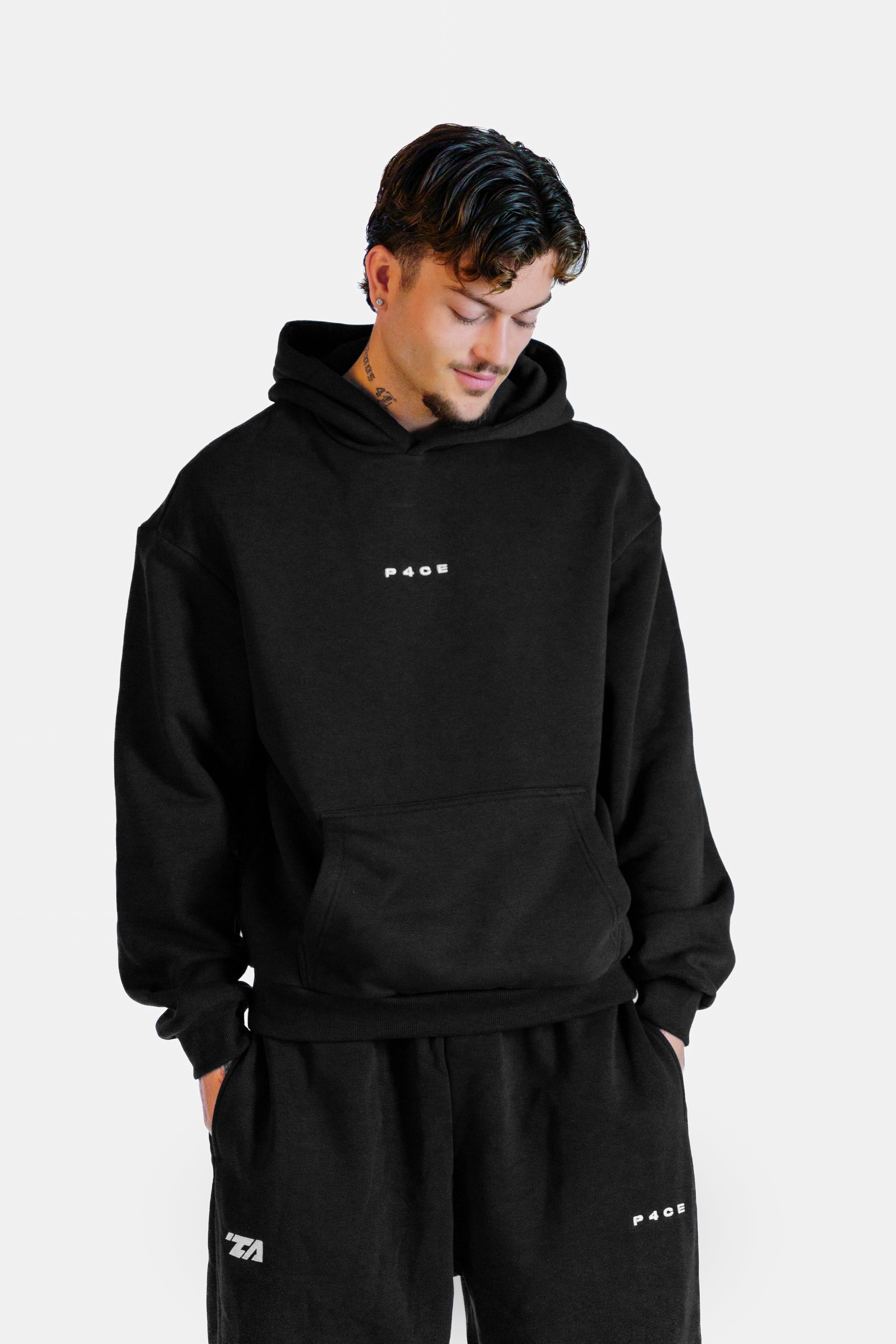 P4CE Hoodie: oversized fit for a relaxed, comfortable look. Perfect for everyday wear, sports, or as a gym cover. The model is 1.84 m tall, 80 kg, and wears size L. Disclaimer: the sample worn by the model in the photos contains a minor spelling mistake, this will not appear on the final product. Recommended wash: not above 40 °C and no dryer.