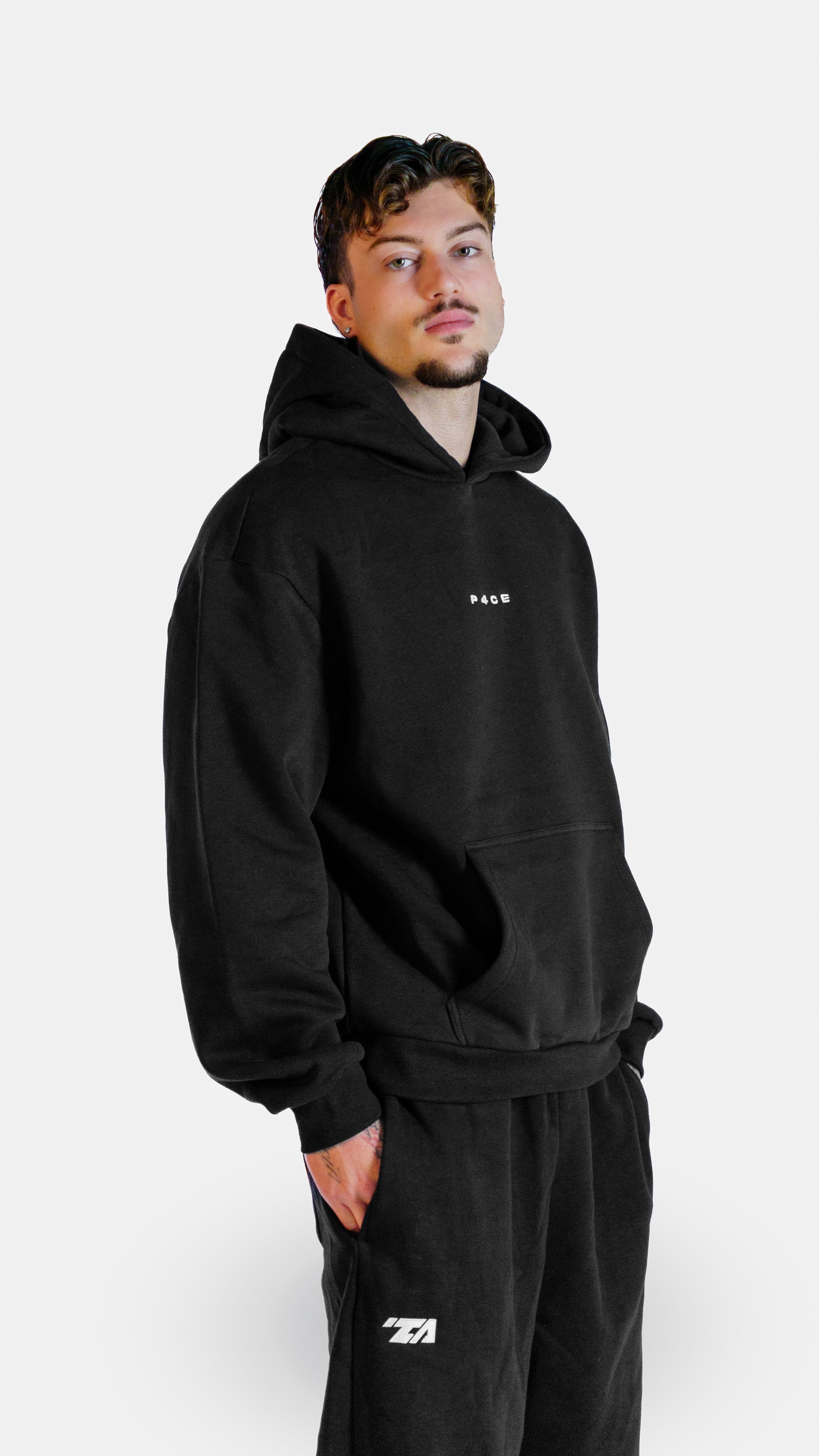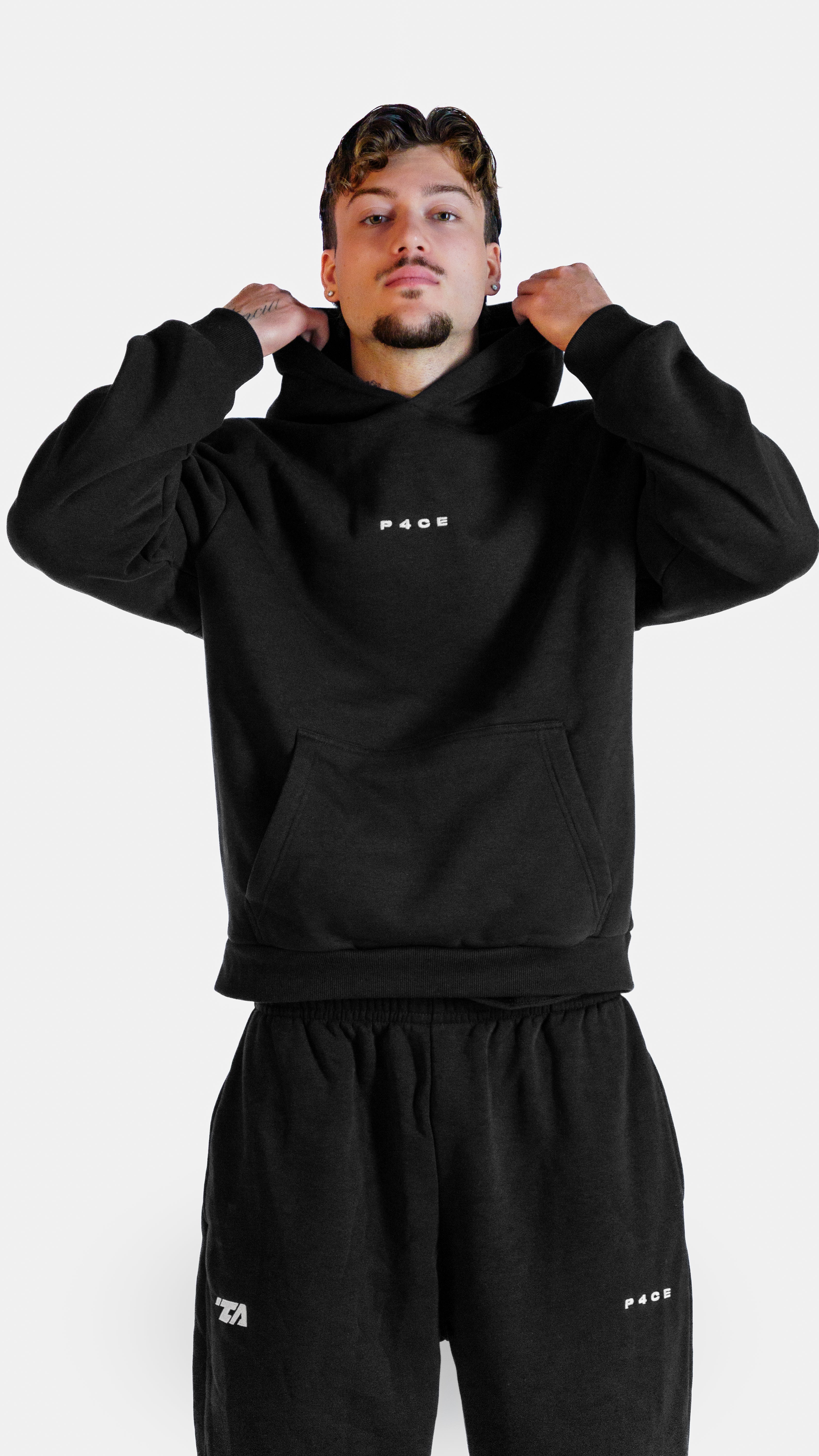 P4CE Hoodie: oversized fit for a relaxed, comfortable look. Perfect for everyday wear, sports, or as a gym cover. The model is 1.84 m tall, 80 kg, and wears size L. Disclaimer: the sample worn by the model in the photos contains a minor spelling mistake, this will not appear on the final product. Recommended wash: not above 40 °C and no dryer.
